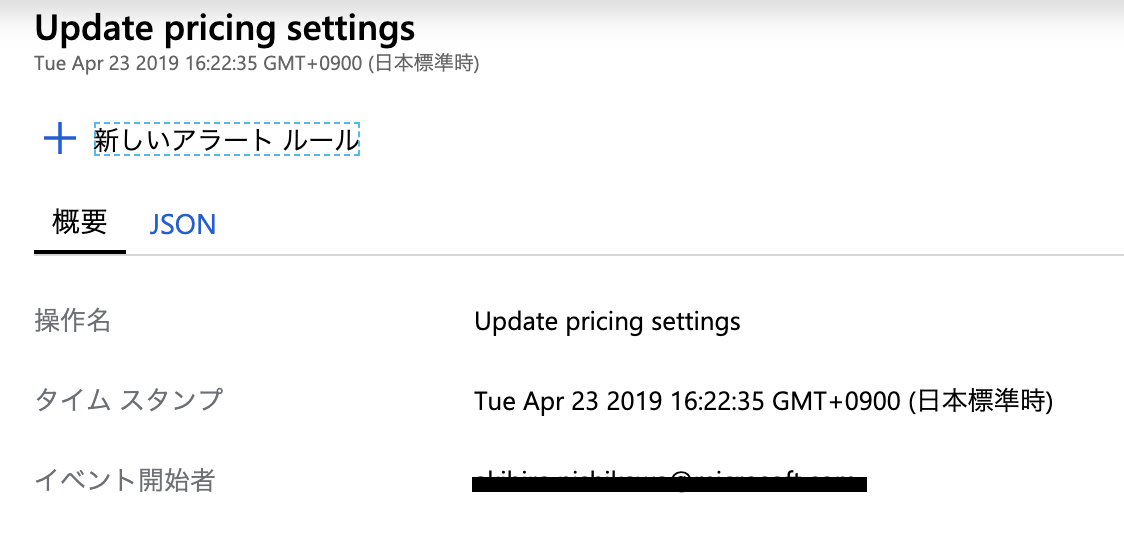 続いて、赤枠で囲んだ「Update pricing settings」を見ると、下図のように、概要タブに時間と誰の操作によるものか記載されていることがわかります。