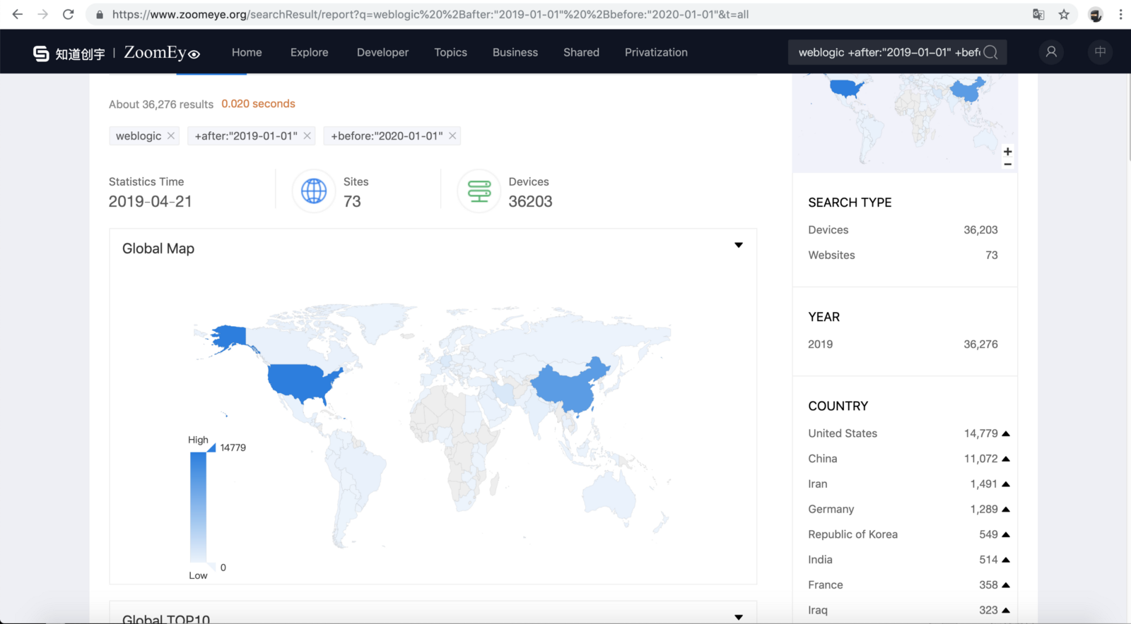ZoomEyeは有名なサイバースペース検索エンジンでOracle WebLogic Serverを検索すると101,040件の結果が出てきます(2019年に限ると36,173件)。検索結果のほとんどはUSや中国に分布しています。