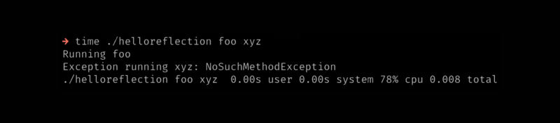 ./helloreflection foo xyz Exception running foo: NoSuchMethodException Exception running xyz: NoSuchMethodException