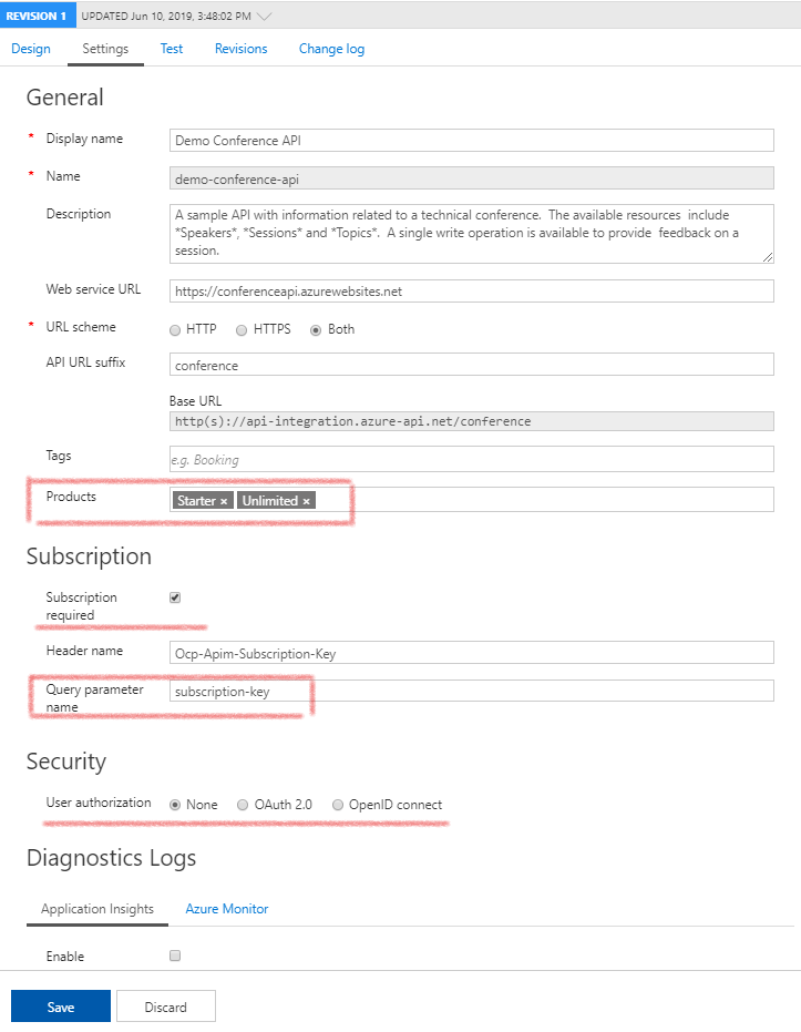 URLスキーム、Descriptionなどを記述する。サブスクリプションが必要な場合、API Keyを指定する必要がある(指定方法はQuery ParameterもしくはHTTP Header)。その他、認証のしくみ(認証無し、OAuth2、OIDC)や製品(Products、他社製品でいうレートリミットプランやサブスクリプションプラン)を指定できる。