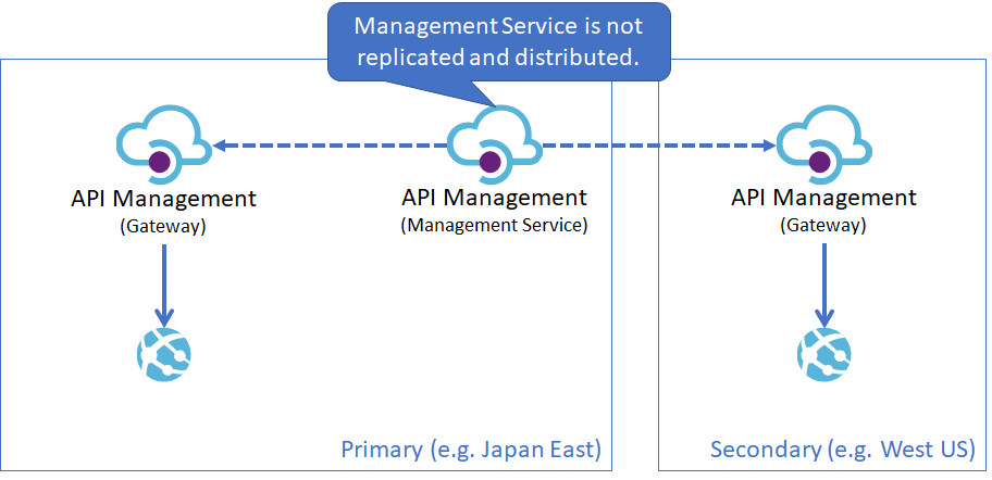 管理サービスはプライマリにのみ存在し、他リージョンにレプリケートされない。そのためプライマリリージョンが停止した場合、設定またはポリシーの更新プログラムを含む構成の変更を Azure API Management サービスインスタンスに適用できなくなる(換言すると、バックアップ・リストアの構成は必須)。