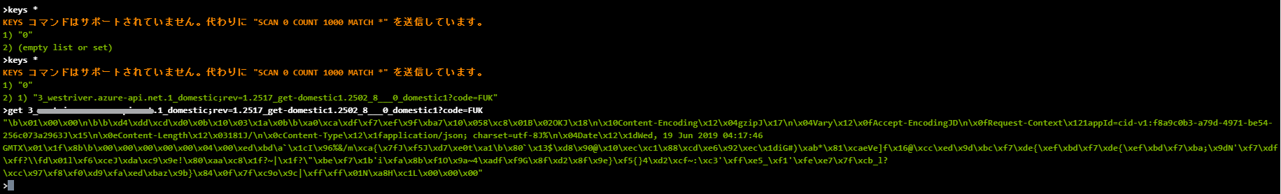 外部キャッシュを簡単に利用可能であることを確認できた。また、応答キャッシュポリシーの場合、レスポンスがまるごと格納されていたが、値キャッシュの場合はほぼ指定した形式で格納されていたことがわかった(先頭にヘッダーと思しきものが付加されている)。