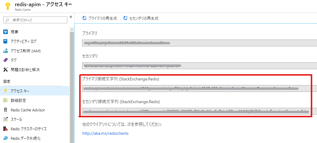 - 接続文字列は、Azure Cache for Redisの設定>アクセスキーにある接続文字列を指定(その他のインスタンスであれば該当する接続文字列を指定する)。