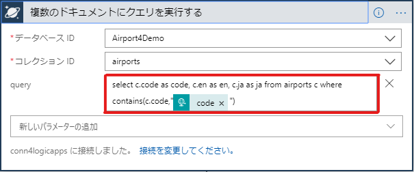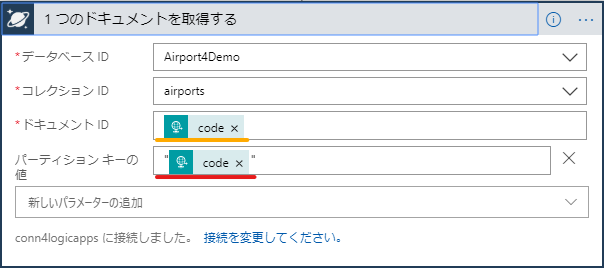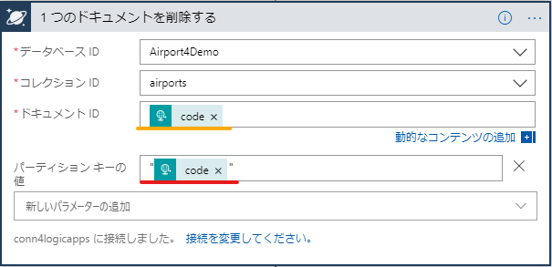 これも[1つのドキュメントを取得する]アクションと同様、[ドキュメントID]はダブルクォーテーションで囲まない点に注意が必要。対して、[パーティション キーの値]は、必ずダブルクォーテーションで囲む必要がある。
