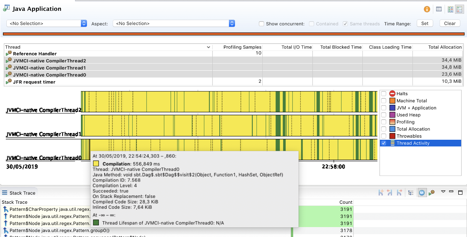 このワークロードは3分以上かかるもので、Java Mission Controlを使用してGraalVMのJITコンパイルスレッドの動作を見ると、実行中はコンパイルが走っていることがわかります。
