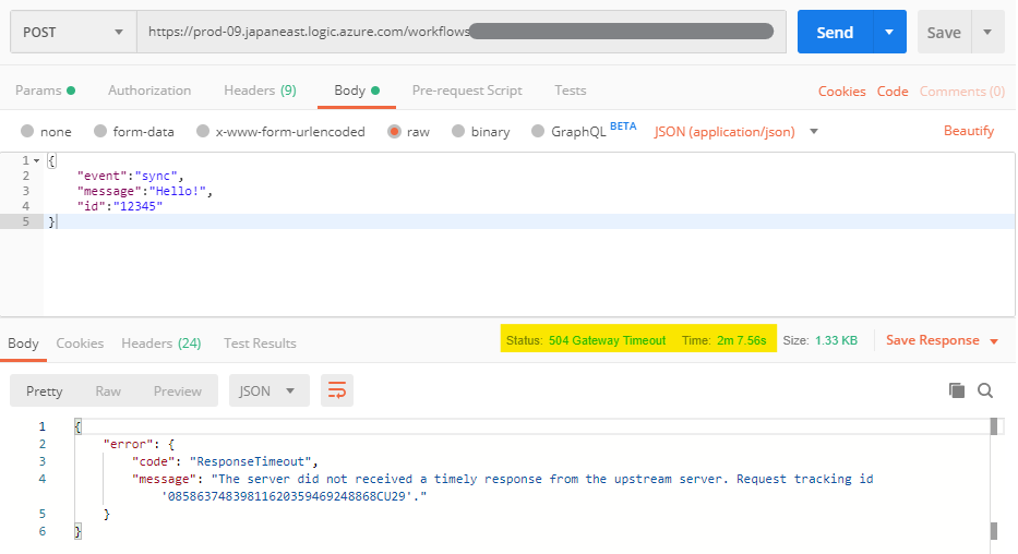 これを親ロジックアプリから実行すると、タイムアウト制限時間内にHTTP同期レスポンスがないために再試行し、結果として失敗してしまう。以下はPostmanから呼び出した例。2分過ぎでタイムアウト発生、504を返していることがわかる。
