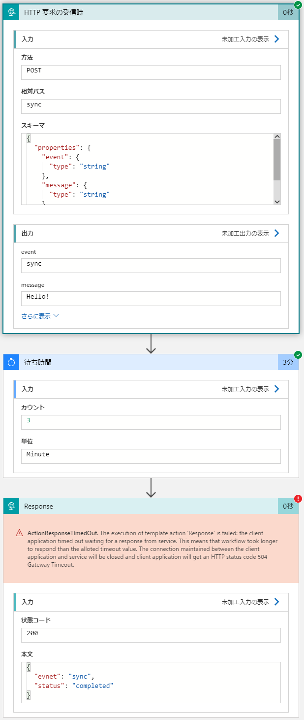 ロジックアプリのHTTP同期応答タイムアウトは120秒(ISEは240秒)で、この間に応答がなければタイムアウトし、次のアクションに進む。