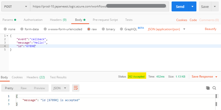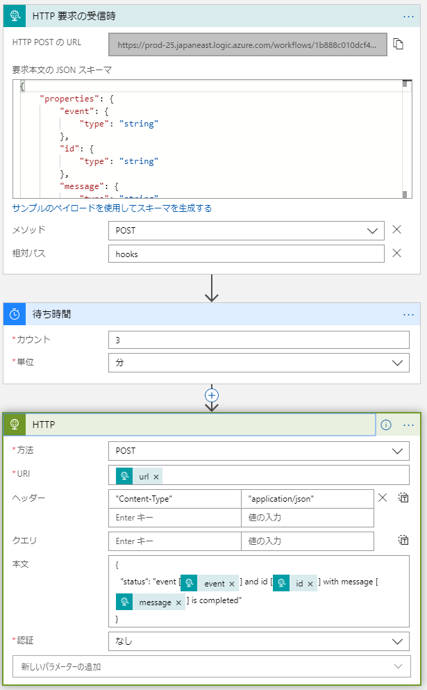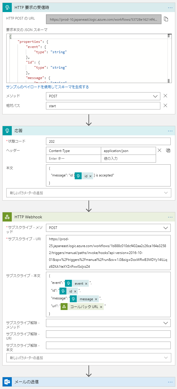 子ロジックアプリも少々変更し、コールバックURLに対して応答を返すようにした。以下はその例。