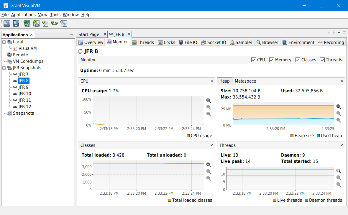 GraalVMにバンドルされているVisualVMで、Java Flight Recorderファイル (.jfr) のデータを可視化する機能がプレビューで使えるようになりました。