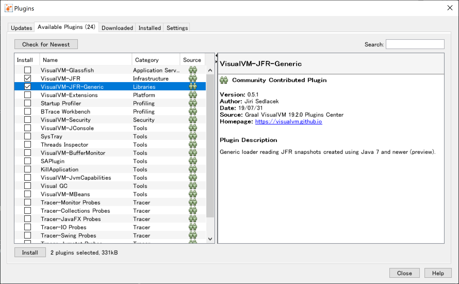 $GRAALVM_HOME/bin/jvisualvmを実行してVisualVMを起動する - Tools > Plugins > Available Plugins を使って利用可能な全てのプラグインをリスト表示し、 VisualVM-JFR と VisualVM-JFR-Generic モジュールをインストールする