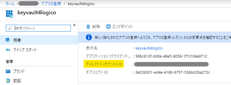 ここで、AZURE_TENANT_IDは登録したアプリ(サービスプリンシパル)の概要で確認できる。