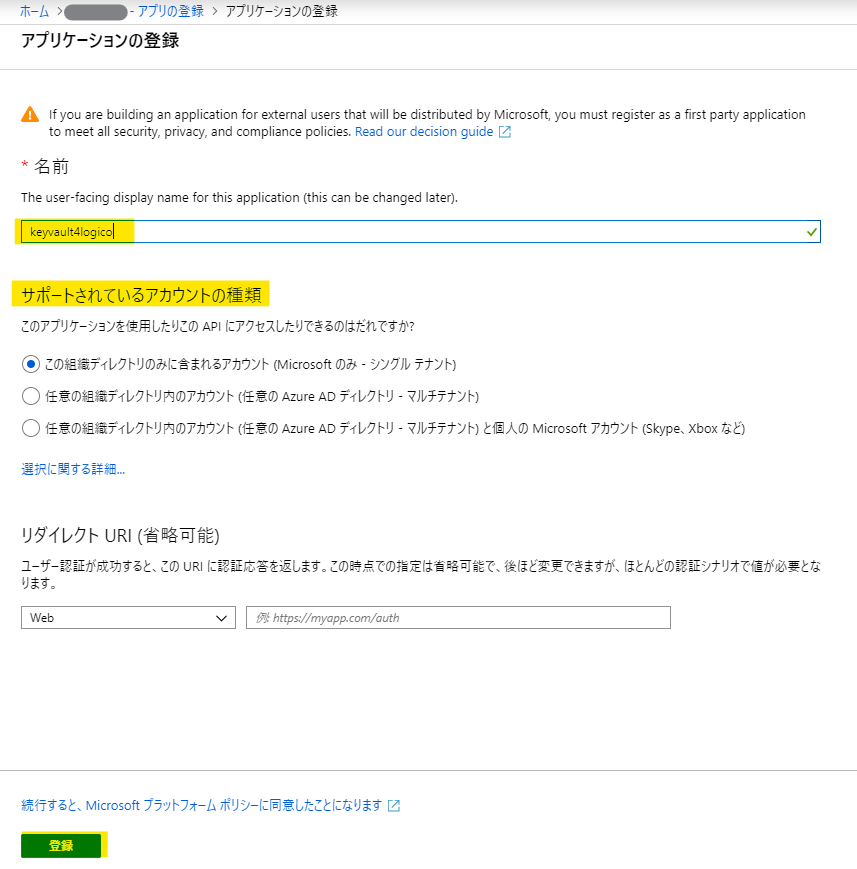 [アプリケーションの登録]では、名前とサポートされているアカウントの種類を指定(リダイレクトURIは省略可能で、今回は指定しない)し、[登録]をクリック。