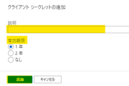 登録したアプリの画面で、管理 > 証明書とシークレット を選択すると、クライアントシークレットを追加できる画面が現れるので、[+新しいクライアントシークレット]をクリックして追加する。指定する項目は説明と有効期限。今回は1年にしておく。