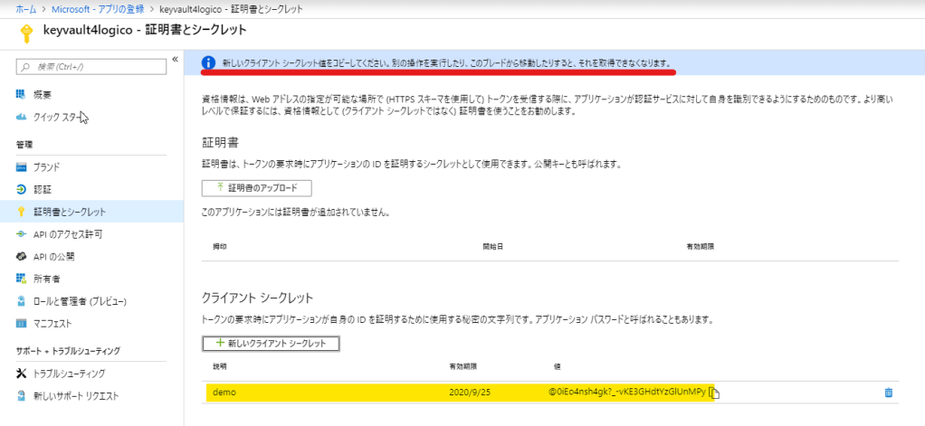 画面が戻ると、値の場所にランダムな文字が入っているが、これがクライアントシークレット。この値は赤下線部の注意書きの通り、後から取得できないので、この時点でメモしておく。ここまでがAzure ADでの操作。