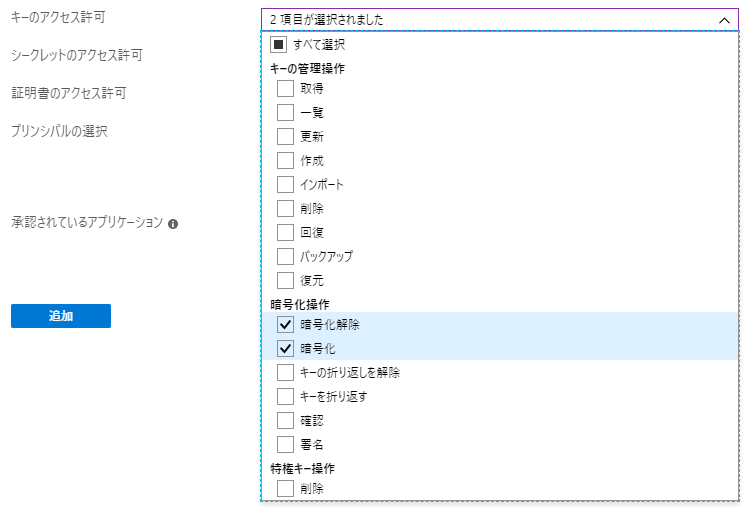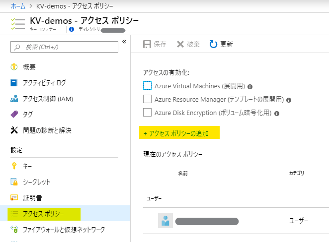 Key Vaultの画面に戻って、設定 > アクセスポリシーをクリックして、画面に現れる[+アクセスポリシーの追加]をクリックして、先ほど登録したアプリに対するアクセスポリシーを設定する。
