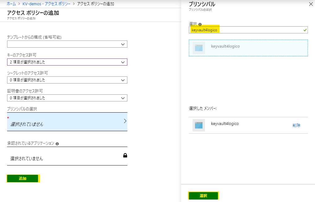 [プリンシパルの選択]では、登録したアプリ(サービスプリンシパル)を検索して[選択]をクリック(今回の場合はkeyvault4logico)。選択後、[追加]をクリック。