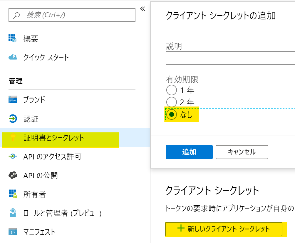クライアントシークレットは、API Clientを表すアプリケーションとして登録したアプリをクリックし、管理 > 証明書とシークレット をクリック、 [新しいクライアント シークレットの追加] をクリックして、説明と有効期限を指定する(説明はオプション)。今回は無期限にしておく。画面が戻ると、値の場所にランダムな文字が入っている。これがクライアントシークレットである。この値は後から取得できないので、この時点でメモしておく。