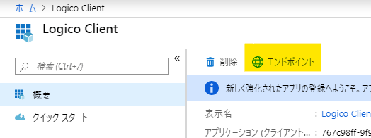 このタイミングで、OAuth 2.0のエンドポイントを確認、メモしておく。登録したアプリケーションの概要で[エンドポイント]をクリックする。