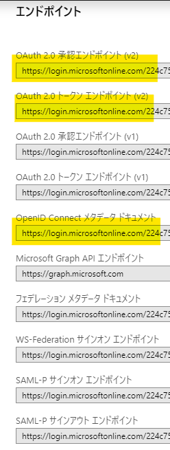 | OpenID Connectメタデータ ドキュメント | https://login.microsoftonline.com/{tenantid}/v2.0/.well-known/openid-configuration |