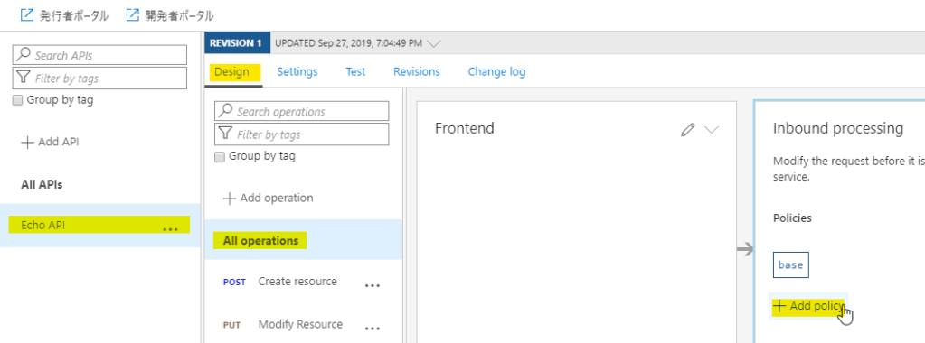 なお、バックエンドサービス自体は以前と同様、OAuth 2.0 tokenを受け付けないものとする。APIはAPIMにデフォルトで存在するEcho APIを使う。