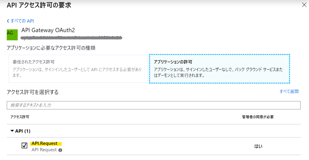 [アクセス許可の要求]が右側から出てくるので、[自分のAPI]タブを選択し、先ほど公開したアプリケーション(下図ではAPI Gateway OAuth2)を選択する。