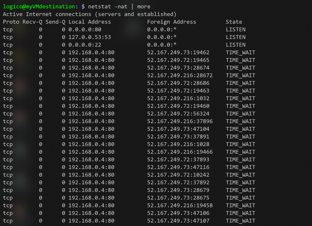 対して、Destination側でnetstat -natを実行すると、Source IPがNAT Gatewayに割り当てたIP(Address、Prefix)であることを確認できる。