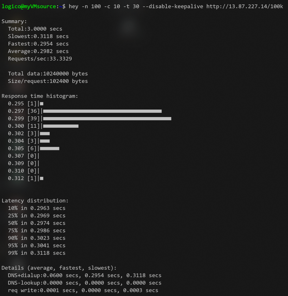 チュートリアル通りに実施すると、Source側でheyを実行した結果は以下のようになるはず。