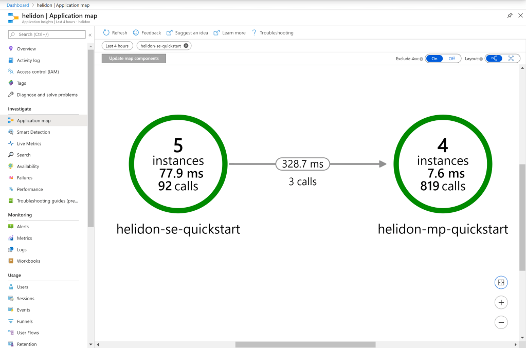 I invoked APIs on SE several times. After a while, I could see the following application map. This application map told me that SE (helidon-se-quickstart) called MP (helidon-mp-quickstart).
