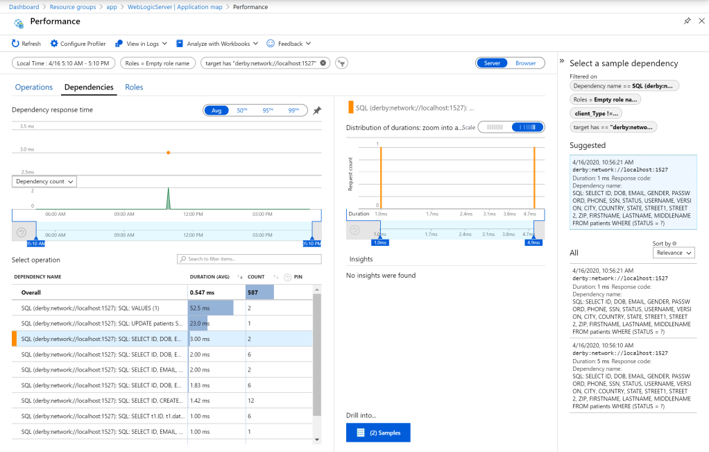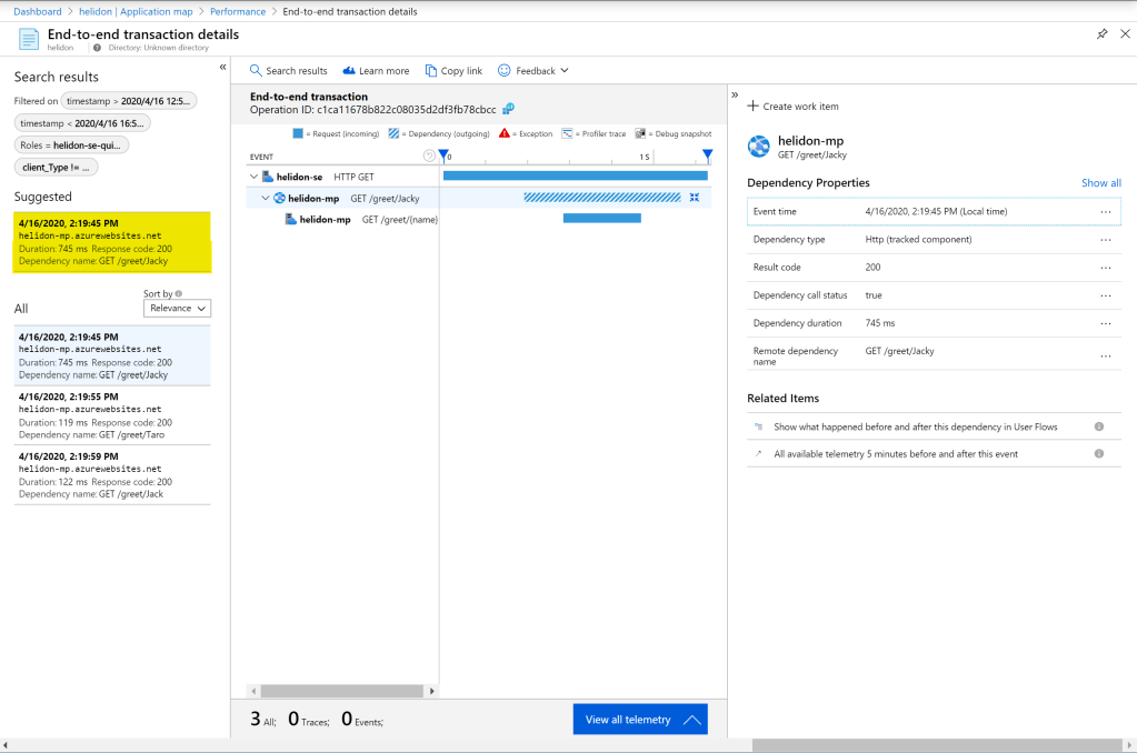 To see end-to-end transaction details, click one of sample dependencies. In this case, I clicked the suggested sample dependency.