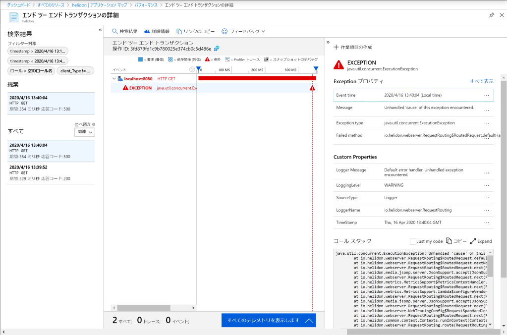 まず、例外の追跡ができるのか確認してみる。具体的には、SEからの呼び出し先、つまりMPのURLを指定せず、例外が発生するようにしてみた。なお、SE内でこの例外の処理は意図的に行っていない。すると、End-to-Endのトランザクションで以下のような感じで例外を確認できる。内容を見てもらうと分かる通り、http://localhost:8080 ってことで、別にクラウドでなくてもオンプレミスも監視対象にできることがわかる。