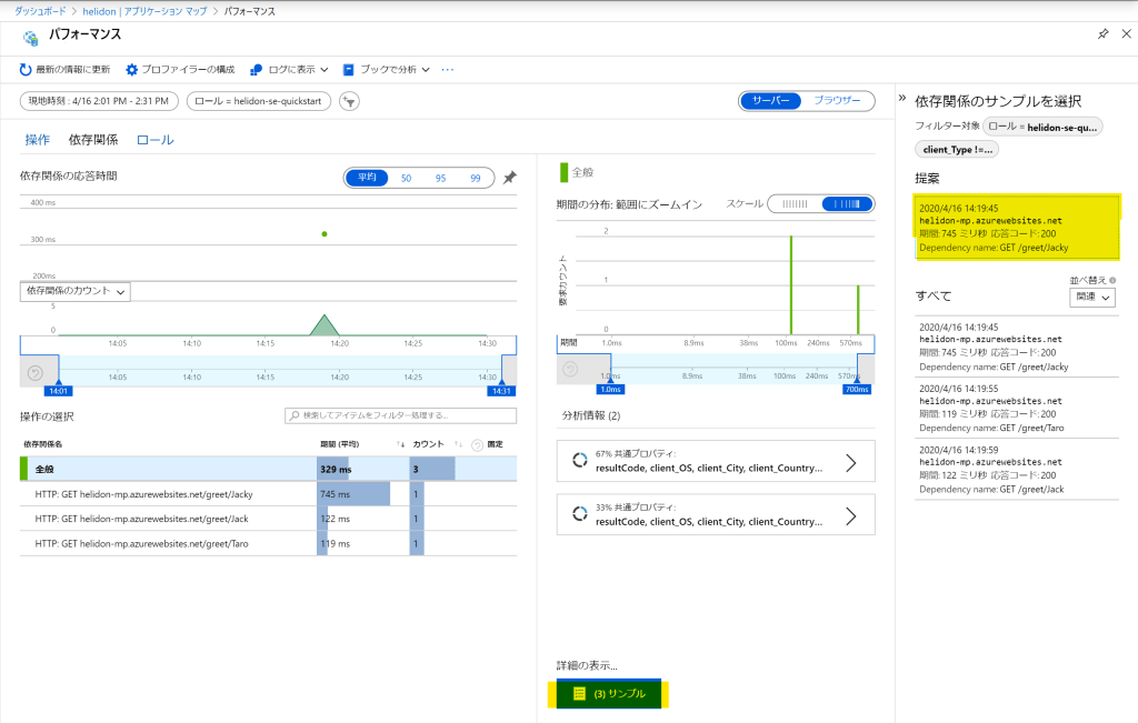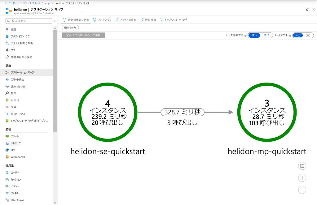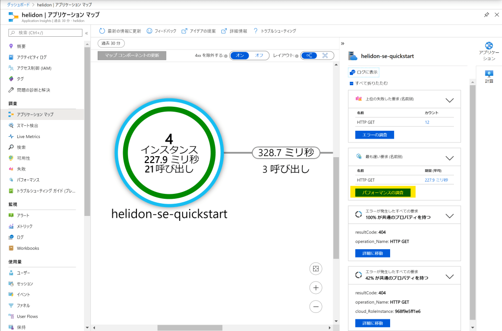 SE(helidon-se-quickstart)からMP(helidon-mp-quickstart)を呼び出していることが図からも確認できる。SEをクリックして、右から出てきたペイン内の[パフォーマンスの調査]をクリック。