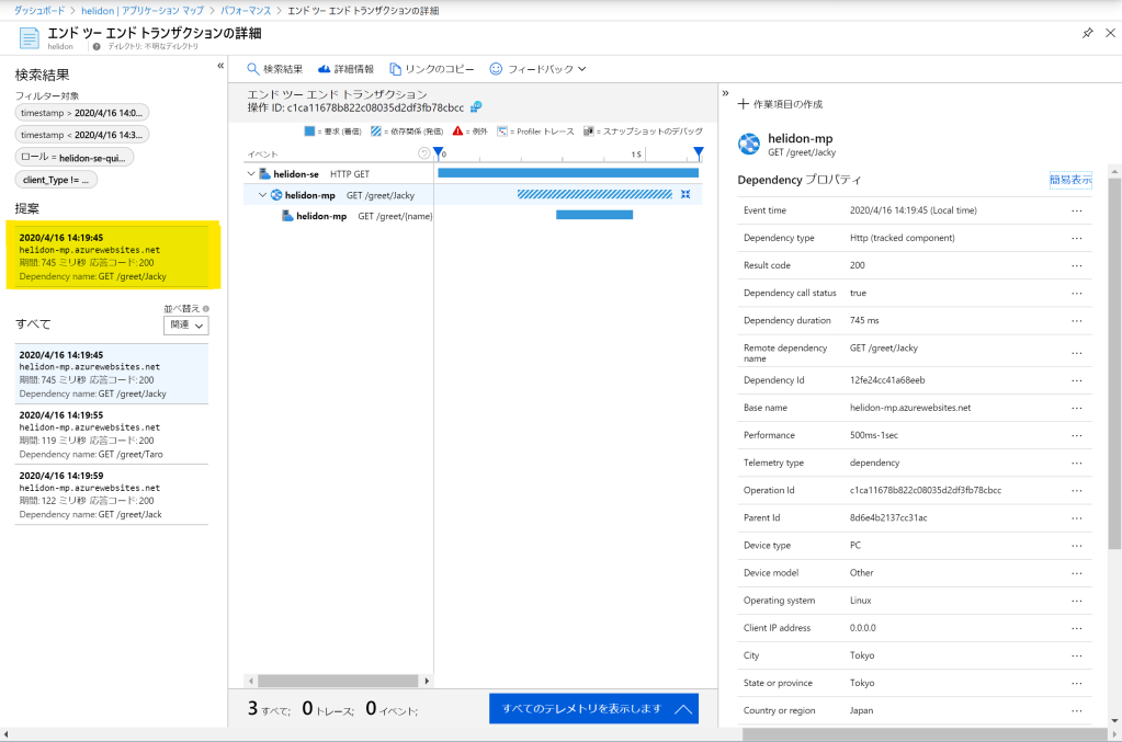 クリックすると、APMツールでおなじみの、依存関係込みの呼び出しトレースを確認できる。