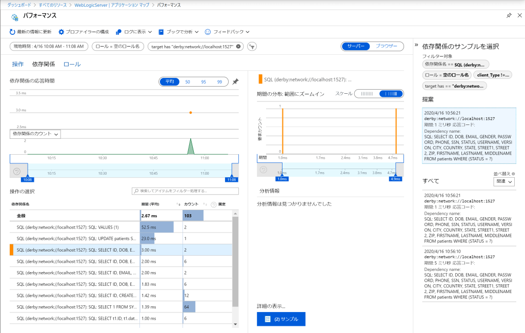 アプリケーションマップのSQLをクリックすると、呼び出されているクエリ等が確認できるので、[パフォーマンスの調査]をクリックすると、以下のようなメトリックにアクセスできる。
