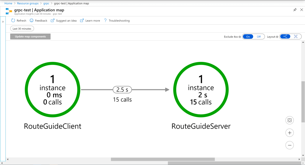 “INFO: Finished RouteChat” indicates that client application was finished. After a few minutes, the following application map should be shown on Azure Portal.