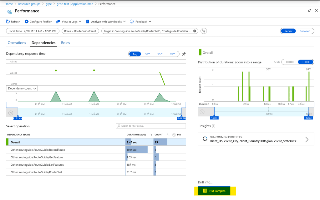 Clicking “(15) Samples” button, samples are listed. Then click suggested sample to see end-to-end transaction detail, and dependencies and metrics should be displayed (see below).
