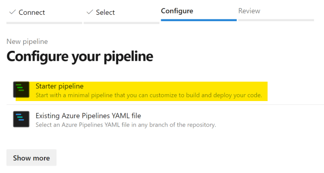 パイプラインの編集は、今回はYAMLファイルを用意していないので、Starter Pipelineを選択。【Show more】をクリックするといろいろ選択できる。