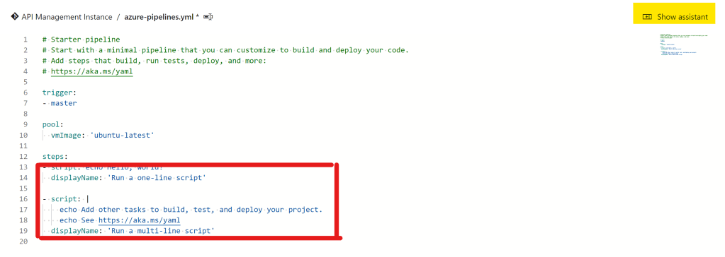 Review画面で以下のようなYAMLのソースが表示される。これだと当然ながらAPIMのインスタンスを生成できないので、赤枠部分の余分な箇所を削除した。その後【Show assistant】をクリックしてタスクを追加していく。