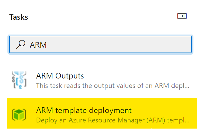 クリックするとタスクを選択できる。今回はARM Template Deploymentを選択する。これはARMテンプレートやテンプレート・パラメータを使ってリソースを作成するタスク。
