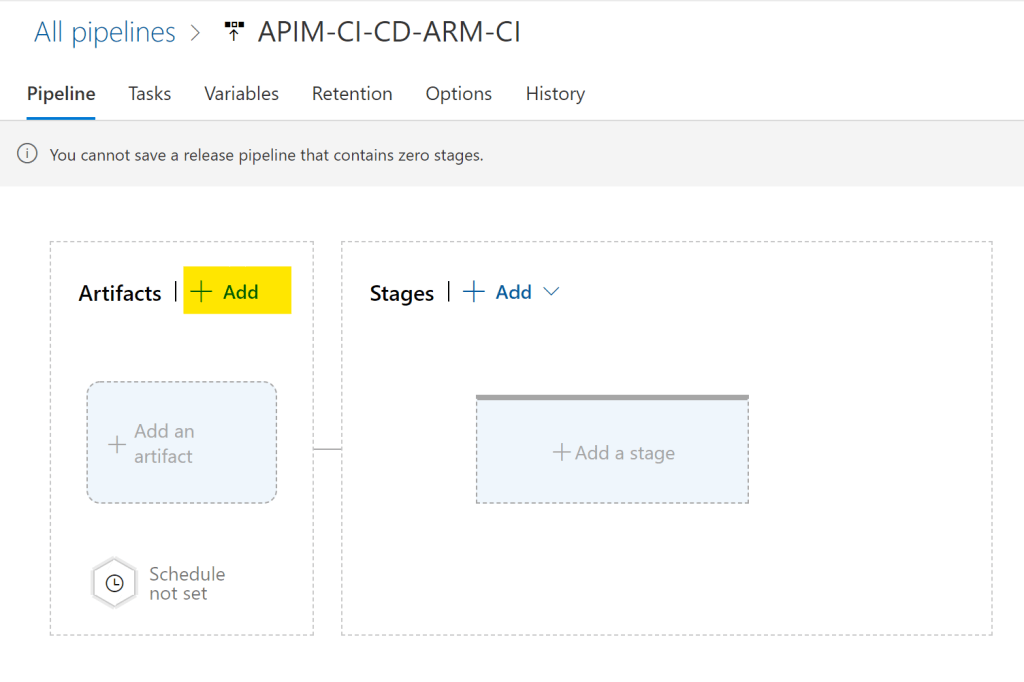 最初にステージのJobを指定するように出てくるが、一旦無視する。まずはリリース・パイプラインの名前を変更する(挙動に影響しないので、もちろんデフォルトのままでもよいが)。鉛筆アイコンをクリックして変更しておく。