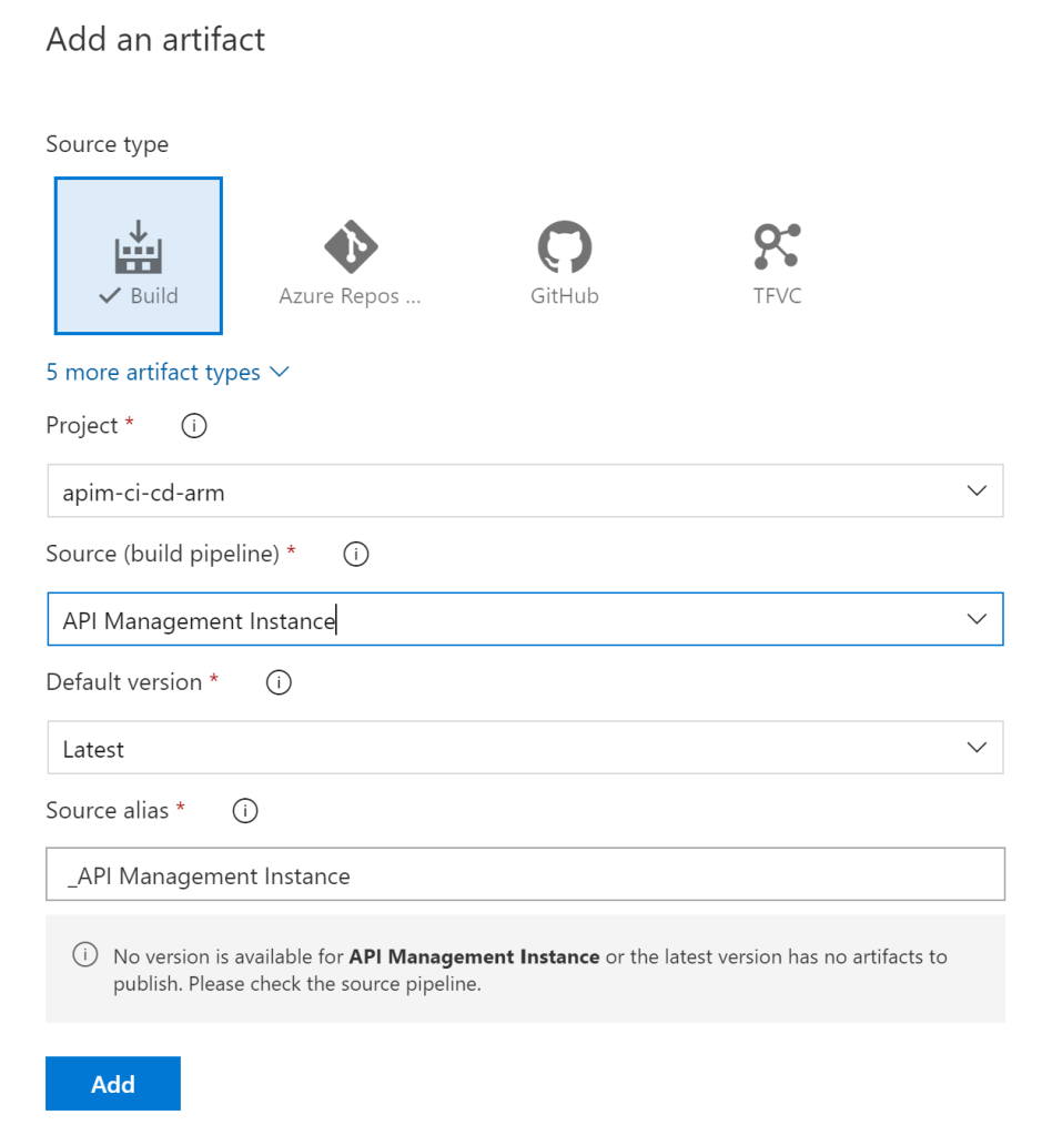 Artifactの追加では、ソースの種類はBuildを選択。プロジェクト、ソースリポジトリ、デフォルトのブランチなどを指定していく。Source Aliasは自動生成されるのでこのまま使う。終了したら、【Add】をクリック。