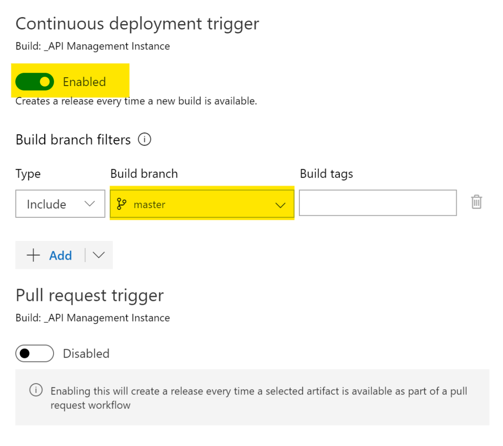 Continuous deployment triggerを有効にする。今回、ビルドブランチフィルターはmasterを選択している。Pull request triggerは無効のままでOK。