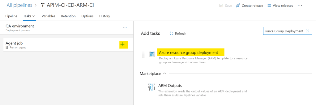 Agent jobの右側にある+をクリックするとAdd tasksが現れる(このあたりはビルド・パイプラインと同じ)。Azure resource group deploymentを選択する。