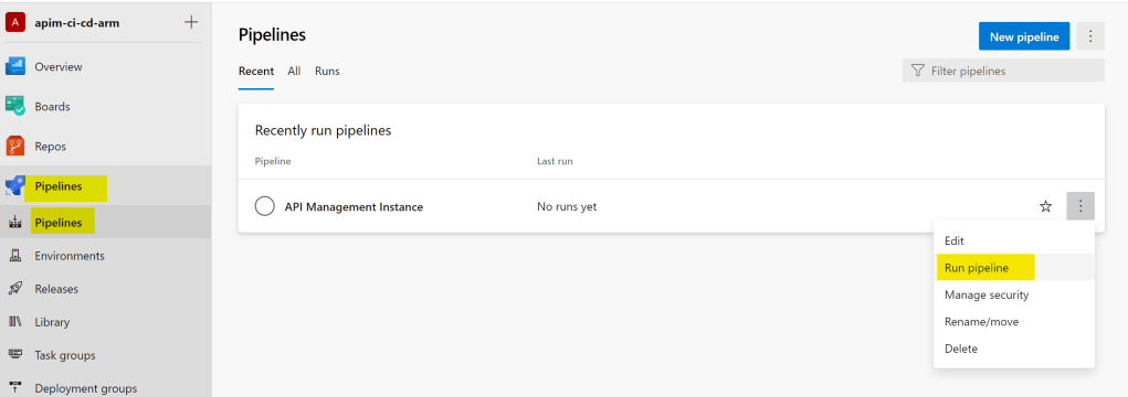 ビルド・パイプラインは保存していただけなので、テスト実行してみる。Pipelines > Pipelinesを選択すると、以下のような画面が現れるので、API Management Instanceの最も右側のアイコンをクリックして、Run pipelineを選択。