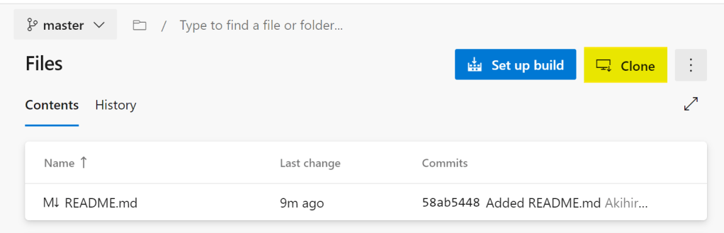 作成したリポジトリに移動し、リポジトリをクローンしておく。画面右上部の【Clone】をクリックする。