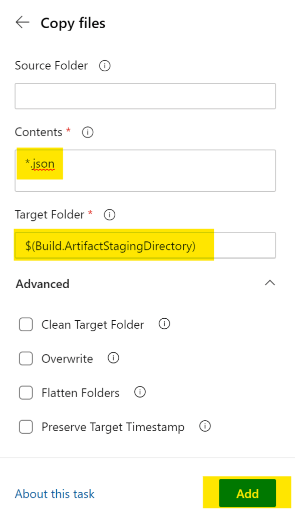 開いた画面で、Contentsとして*.json、Target Folderとして、$(Build.ArtifactStagingDirectory)を指定。Source Folderはリポジトリのルートを対象にしたいので、空のままでOK。必要に応じて、Advancedの設定も加える(今回は何もしない)。設定が完了したら、【Add】をクリック。