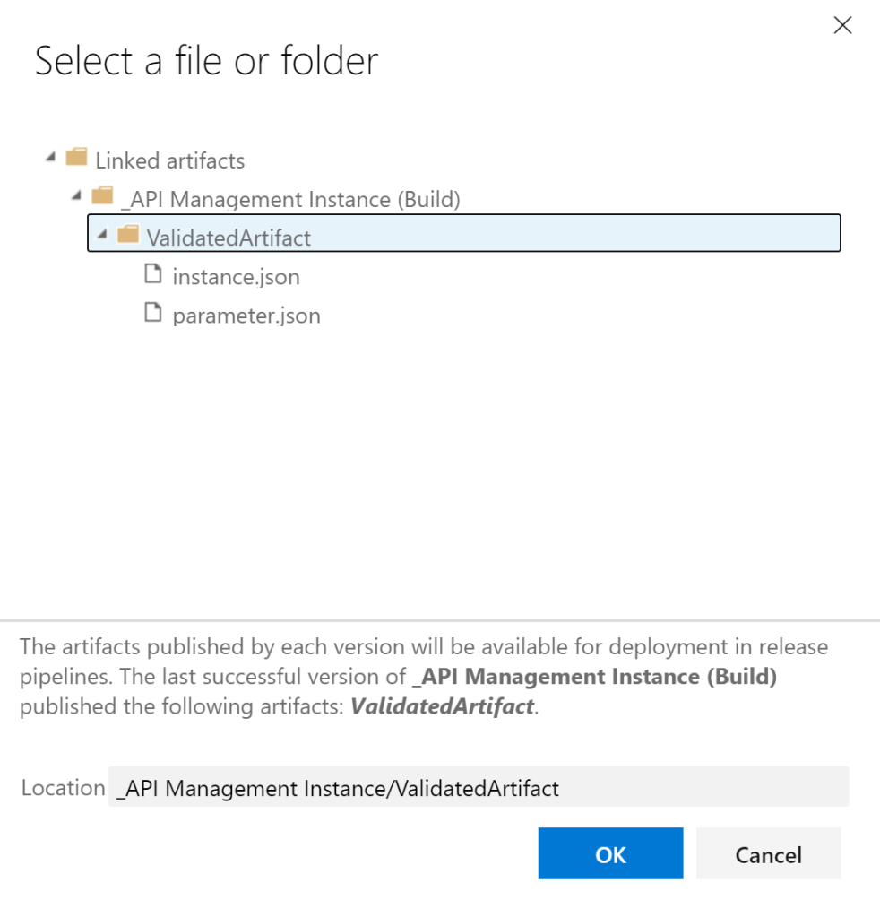 なお、テンプレートとテンプレート・パラメータは右側の【…】をクリックし、現れる画面で_API Management Instance (Build) をクリックすると、ビルド・パイプラインでコピー先として指定したValidatedArtifactがあるので、これを選択。この中にファイルがある場合はそれを選択し、ない場合はフォルダのみ選択して【OK】をクリックし、/instance.jsonもしくは/parameter.jsonを補完する。
