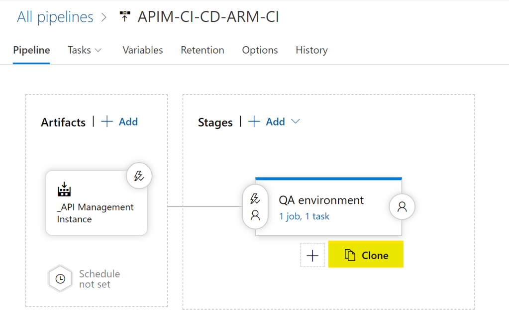 ステージ名をProduction environmentに変更する。さらに、ARMテンプレートのデプロイタスクの名称もわかりやすく変更しておく。今回は “Azure Deployment: apim-ci-cd-arm-prod” にした。