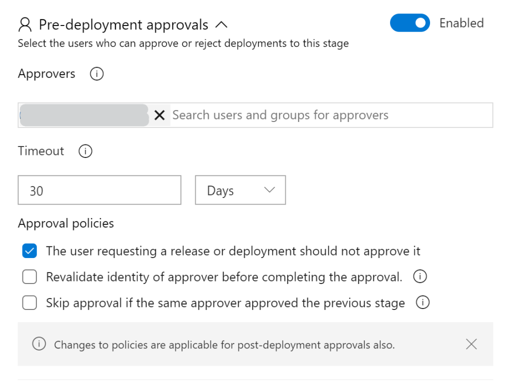 デプロイ前の承認を有効にして、承認者を決める。ユーザーでもグループでもかまわない。今回はリクエストした人間が承認しないように、Approval policiesを指定している。