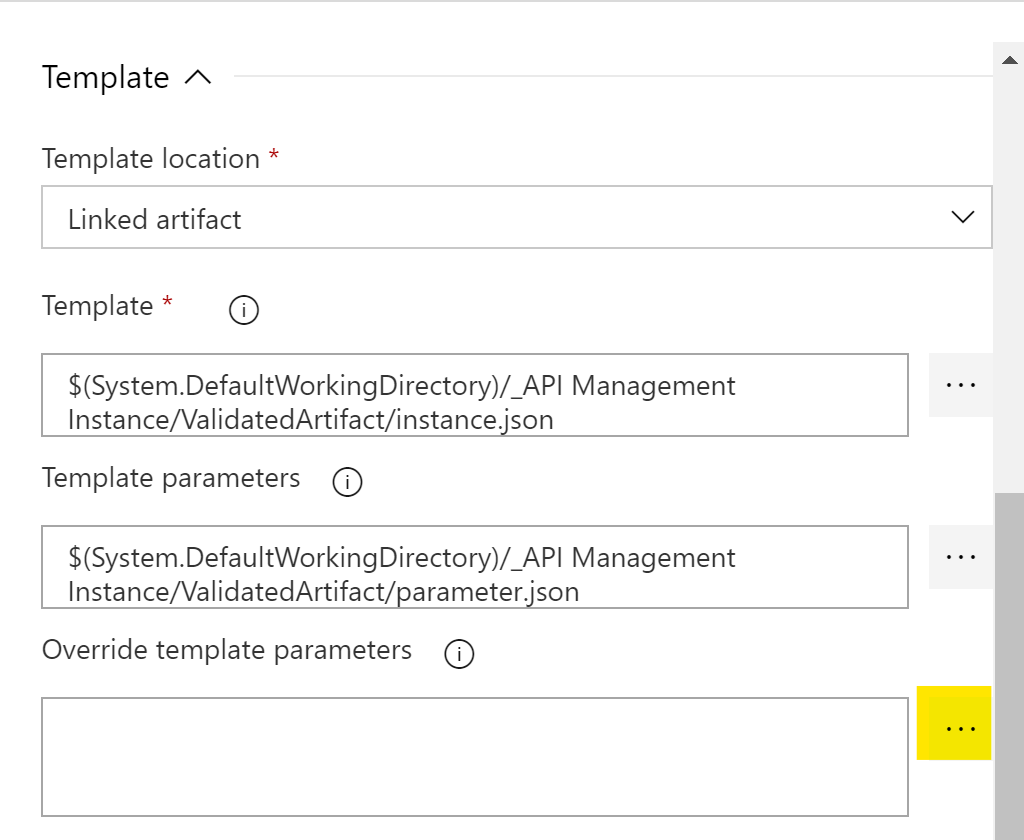- Template parameters: $(System.DefaultWorkingDirectory)/_API Management Instance/ValidatedArtifact/parameter.json