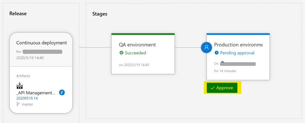 End to endテストのため、ビルド・パイプラインをマニュアル実行する。これは5) と同じなので詳細は割愛する。QA環境が出来ると、Production環境作成の前に承認依頼がメールで送信されてくる。リリース・パイプラインの状況はPending approvalをクリックして確認できる。